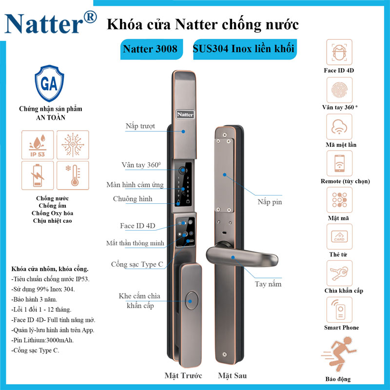 – Phương pháp mở khóa: Face ID, Vân tay, Thẻ từ, Mật mã 6-8 số, Smartphone, Chìa khẩn cấp;
