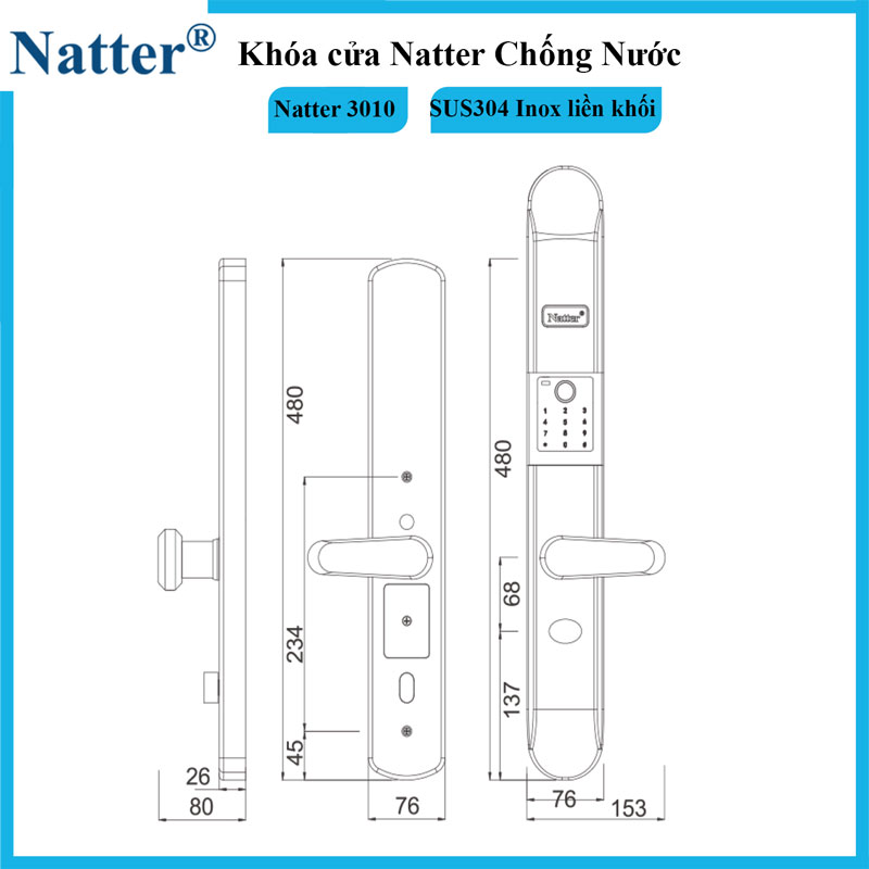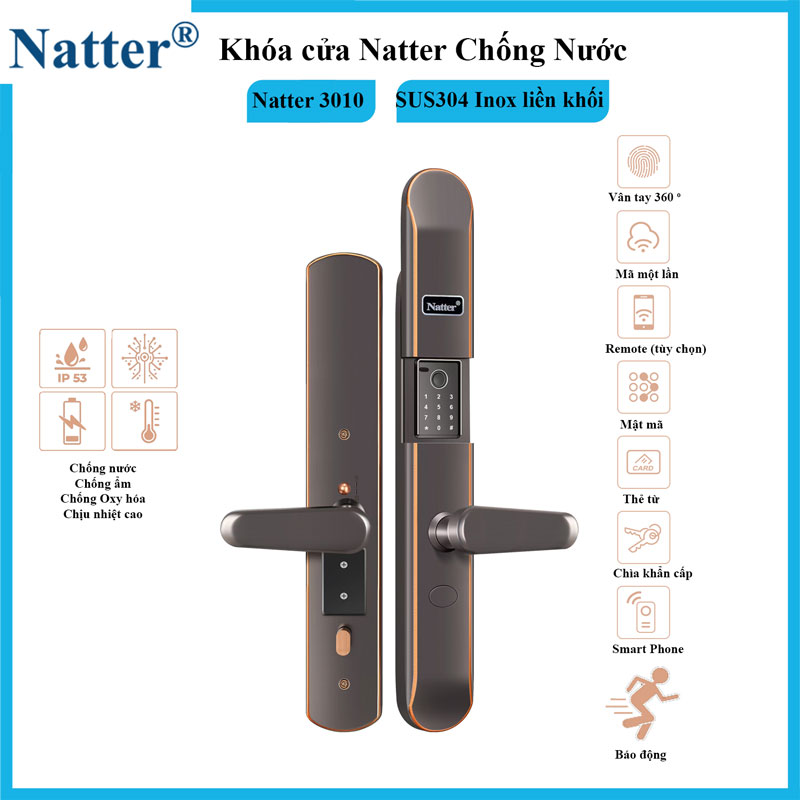 Khóa cửa Natter 3010 thông minh chống nước IP53- Vân tay mặt đơn